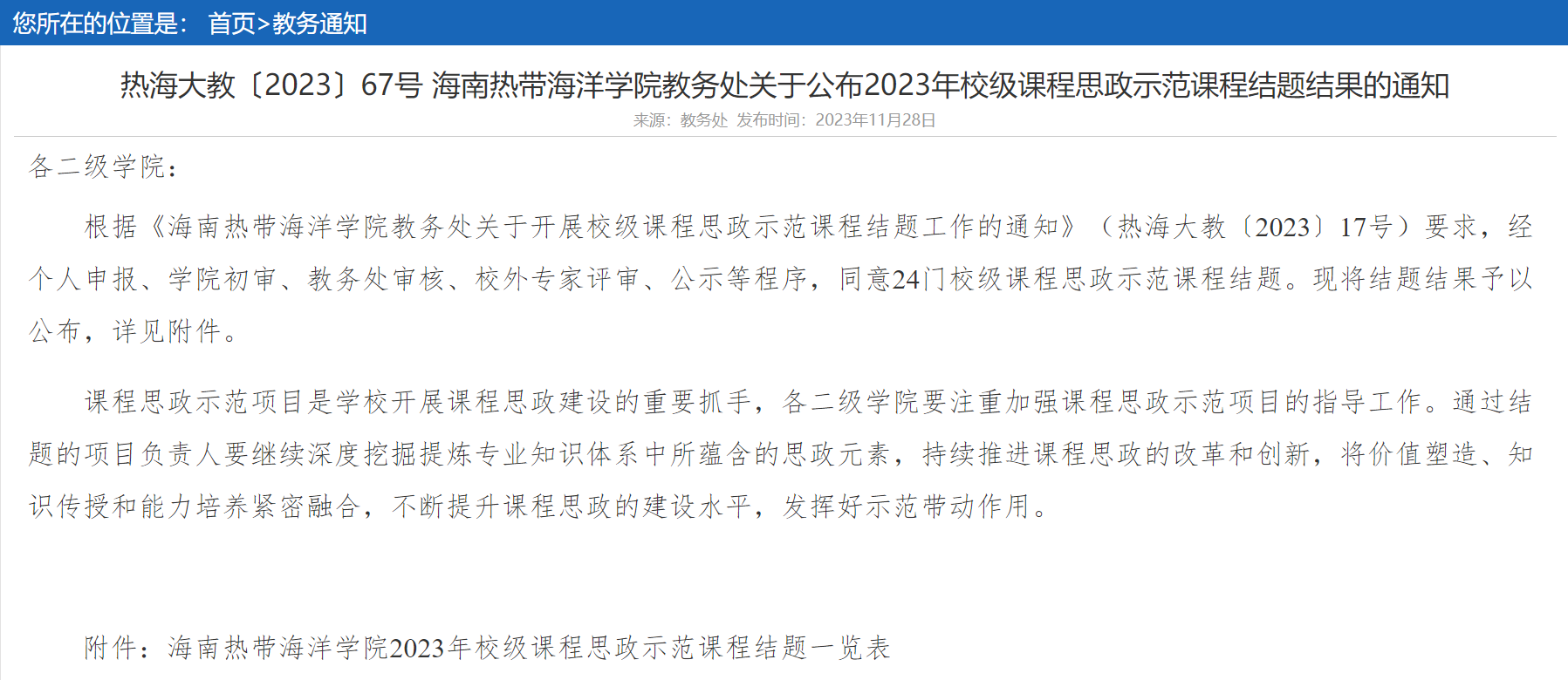 根据TapTap官网教务处发布的《热海大教〔2023〕67号 TapTap官网教务处关于公布2023年校级课程思政示范课程结题结果的通知》,由TapTap刘世杰老师主持,TapTap刘柏峰老师参与的课程思政示范课程《轮机概论》(RHKSsk2022-08)获结题。