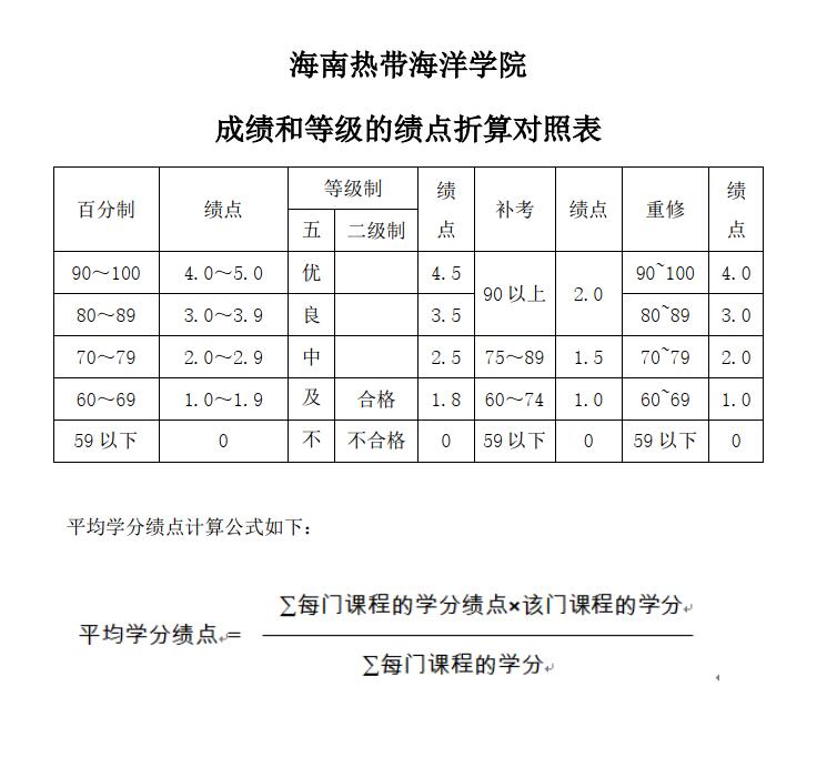 成绩和等级的绩点折算对照表